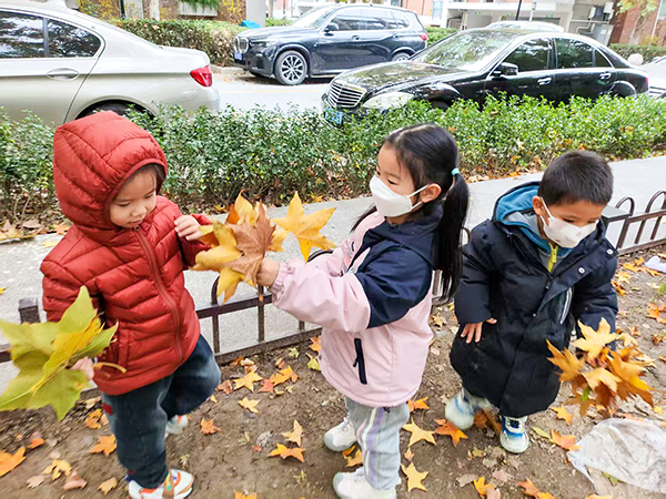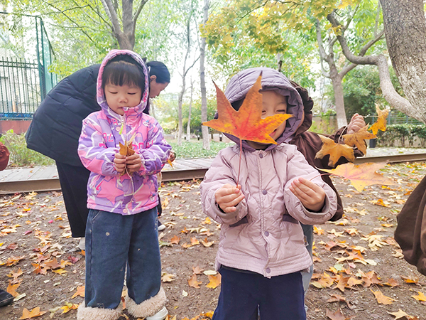 冬日的自然虽少了繁花似锦,却藏着别样惊喜。孩子们走进园区角落,开启“冬拾”之旅——捡拾枯黄的落叶,每一片落叶都是自然馈赠,都充满着趣味。他们细细观察叶片的纹理和形态,感受冬日里生命的坚韧与内敛,将自然之美悄悄收藏。